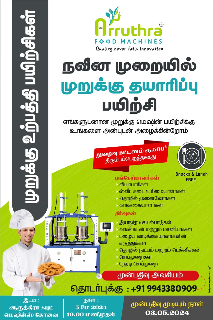முறுக்கு வியாபாரிகள் முறுக்கு மெஷினை எவ்வாறு தேர்ந்தெடுத்து, வெற்றிகரமாக ப்ரொடக்சன் எடுப்பது❗🤔 தெரிந்து கொள்ள விரும்புகிறீர்களா⁉️🤩 9943380909 என்ற எண்னை தொடர்பு கொண்டு உங்கள் பதிவை உறுதிசெய்யுங்கள் 🙏🤝